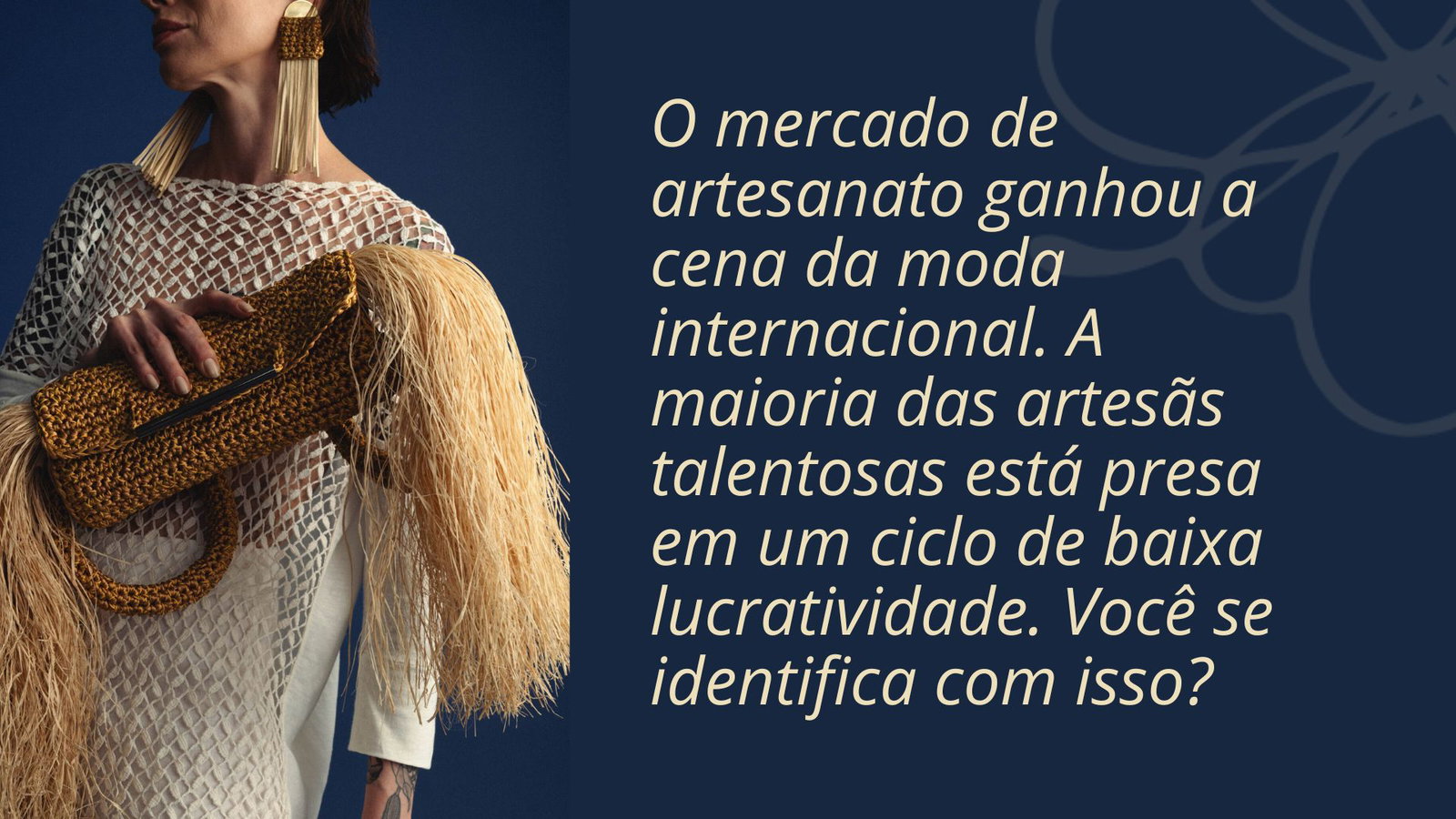 Te entrego o passo a passo da produção e design, o propósito da marca e o modelo de negócio. A qualidade de vida do artesanato e a lucratividade de uma marca forte. É o acesso a um negócio que o mercado já validou, pronto para faturar.